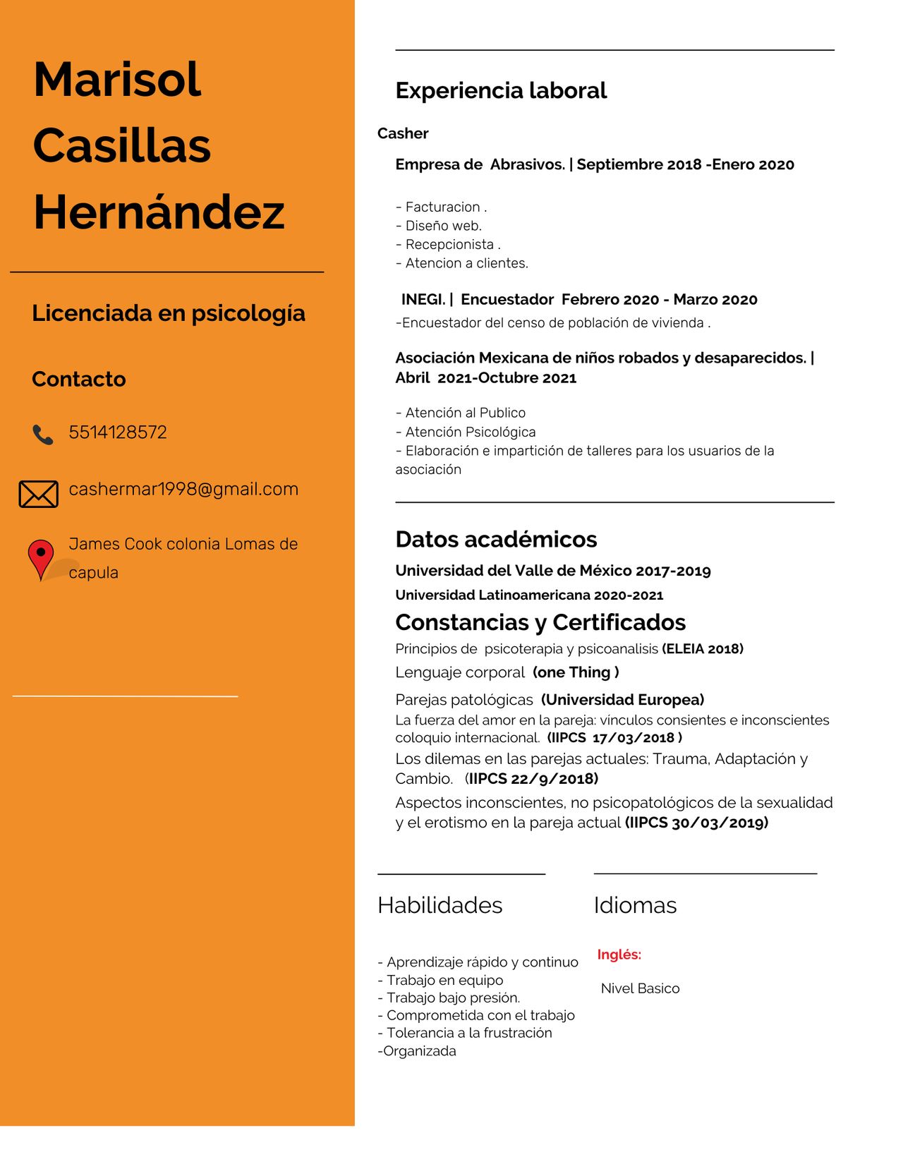 Soy Marisol Casillas Hernández, psicóloga enfocada en brindar un acompañamiento emocional cálido, humano y basado en evidencia científica. Trabajo principalmente con Terapia Cognitivo-Conductual y Terapia de Esquemas, ayudando a las personas a comprender sus pensamientos, regular sus emociones y desarrollar herramientas para una vida más plena. Mi estilo es empático y profesional; busco crear un espacio seguro donde mis pacientes puedan sanar, crecer y construir relaciones más sanas consigo mismos y con los demás.